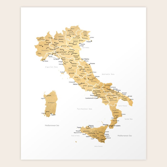 Map of italy with cities in gold P Art Print by blursbyaiShop